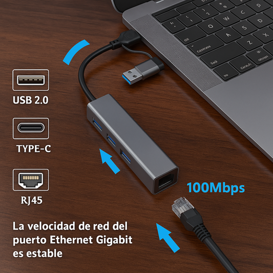 Convertidor USB Tipo C a 3 Puertos USB + Puerto RJ45 Red Ethernet Alta Velocidad