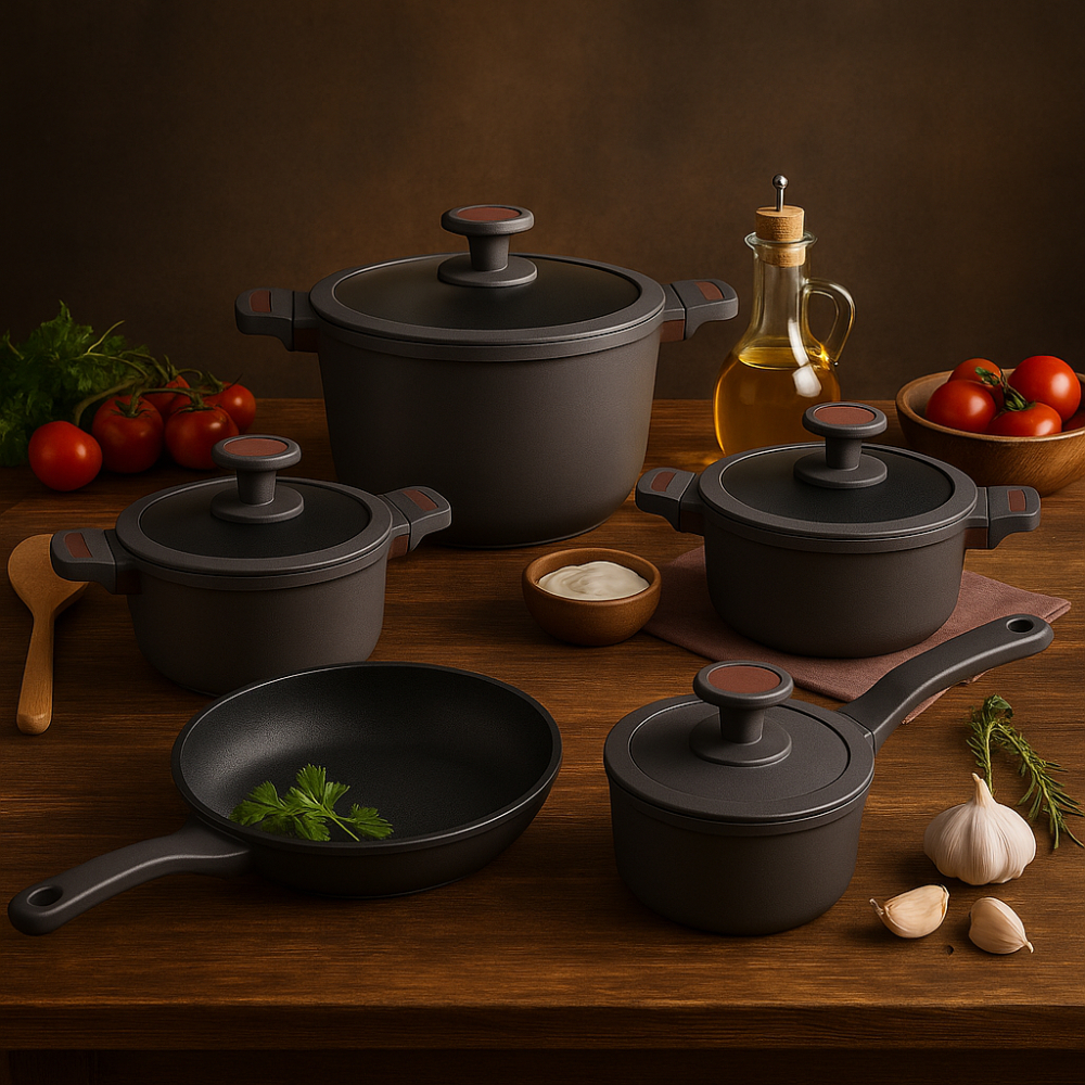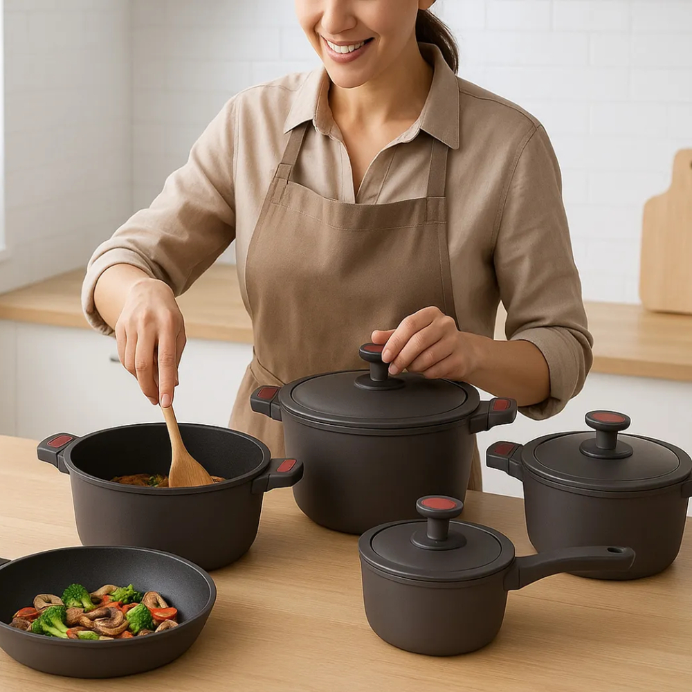 - Set de 9 piezas: ollas, sartén, sartén tipo wok y tapas.