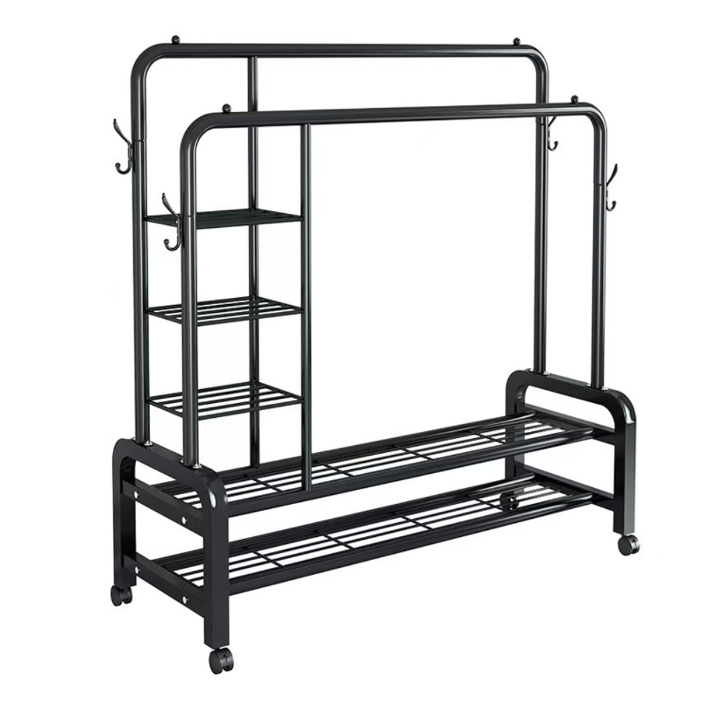 Organiza tu ropa y calzado con estilo y resistencia. Este perchero zapatero doble es la solución ideal para mantener en orden tus prendas y accesorios. Su diseño multifuncional combina espacio para colgar ropa, estantes para zapatos y prácticos ganchos laterales, adaptándose a cualquier espacio del hogar u oficina.