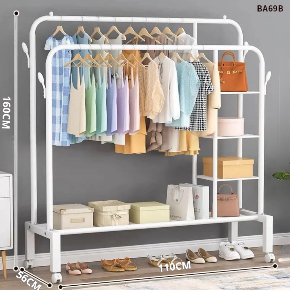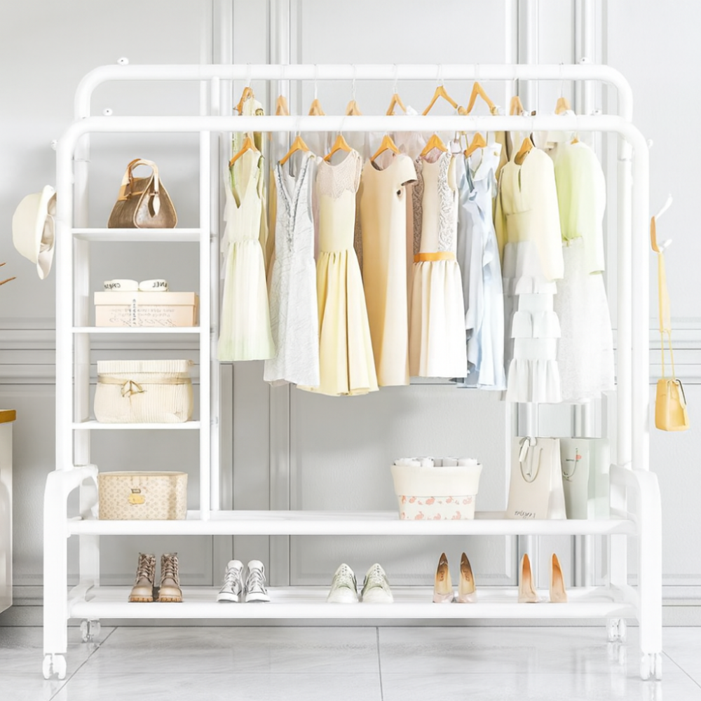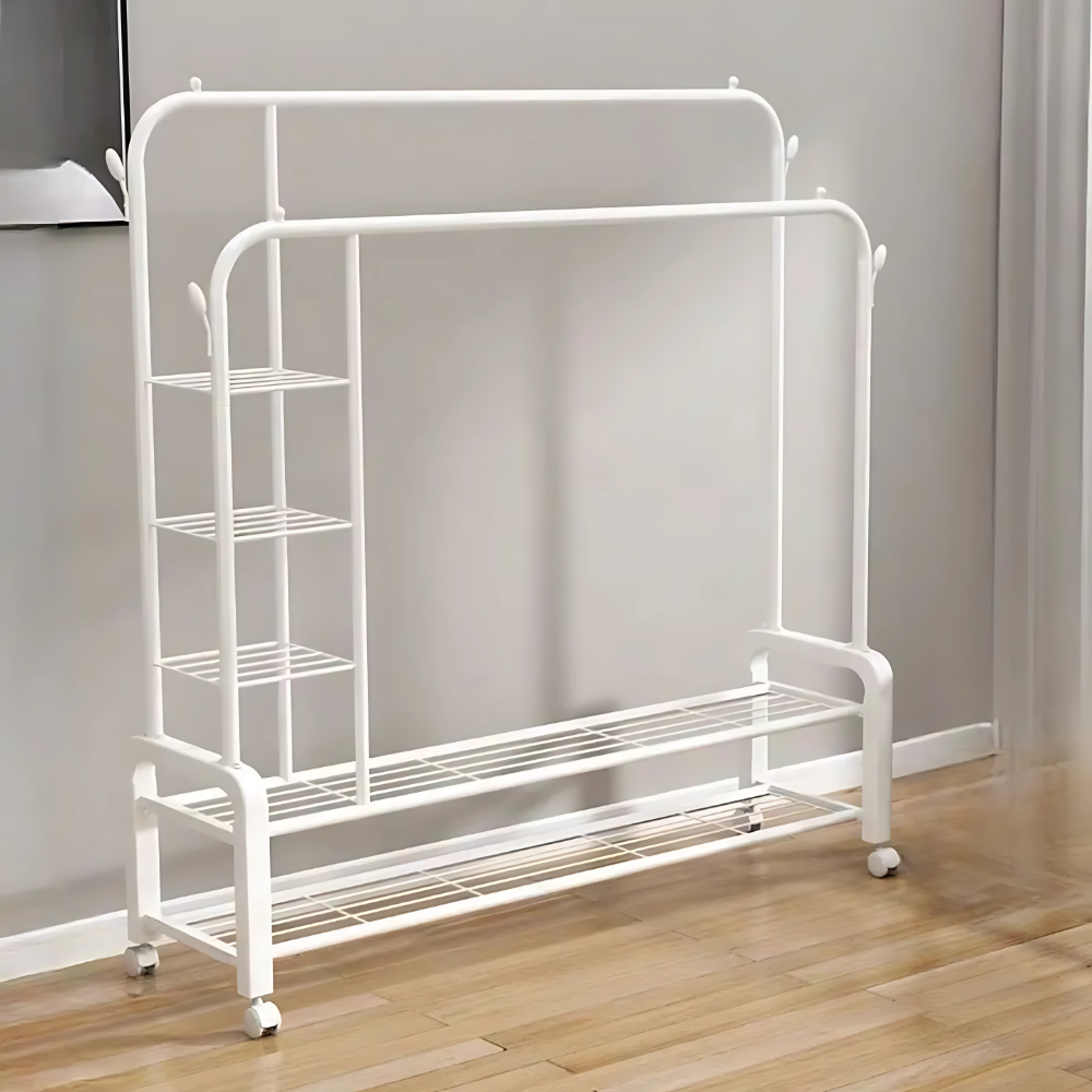 Fabricado en tubos de metal de alta calidad, soporta hasta 58kg de peso sin deformarse, garantizando estabilidad y durabilidad. Incluye estantes adicionales para zapatos y accesorios, así como almohadillas antideslizantes para proteger el suelo y brindar mayor seguridad.